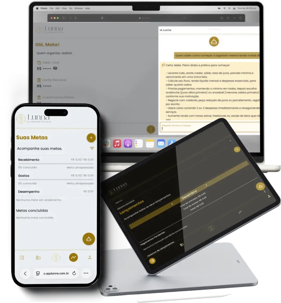 Sim! Cada passo do método é leve e direto. A Lunna, nossa assistente virtual, ainda te ajuda a lançar gastos em segundos.